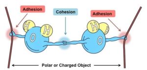 Have you ever dipped your finger in water and noticed how some water sticks to it? That’s adhesion! Adhesion is the force that makes water molecules stick to other substances. It’s the reason why water can climb up the inside of a glass or spread across a paper towel.